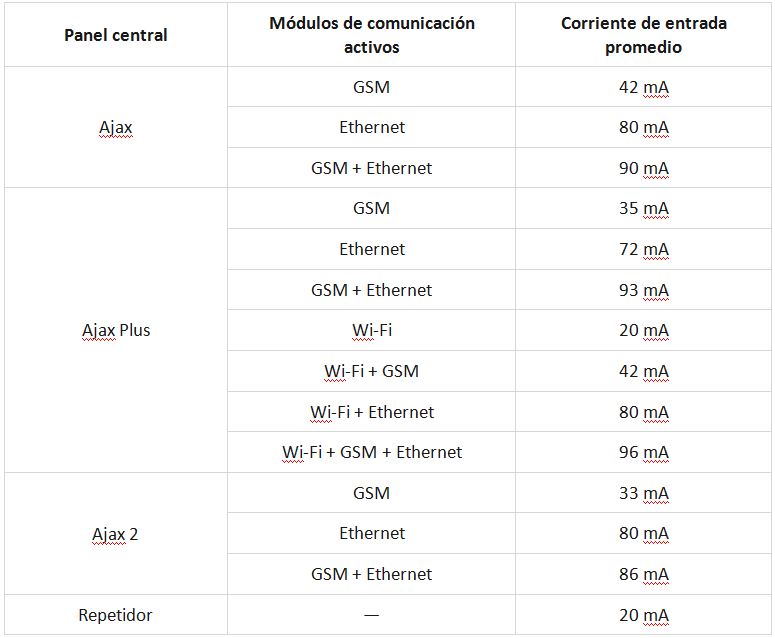 Gracias a la gran eficiencia de las centrales de alarma Ajax y el repetidor Ajax, se ha reducido el consumo al mínimo para que la alarma funcione durante periodos muy prolongados de tiempo. El consumo se basa sobre todo en las comunicaciones activas de la central, que se pueden ver en la siguiente tabla: