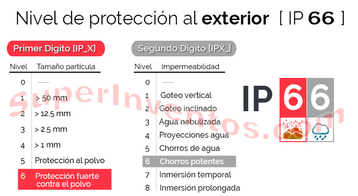 Para saber si la cámara que hemos elegido es apta para instalarse en intemperie, nos debemos fijar en que entre sus características se encuentre grado de protección IP65 o superior. Estos números hacen referencia al nivel de protección en exterior. El primer dígito es frente a partículas sólidas y polvo, y el segundo frente al agua. Actualmente, la mayoría de modelos tanto CCTV como IP suelen llevar una IP66 o incluso IP67, lo que las hace idóneas para su uso en exteriores. Para que nos hagamos una idea, una IP66 representa la protección máxima frente a polvo y también es capaz de soportar chorros potentes de agua. Aquí tienes una imagen explicativa.